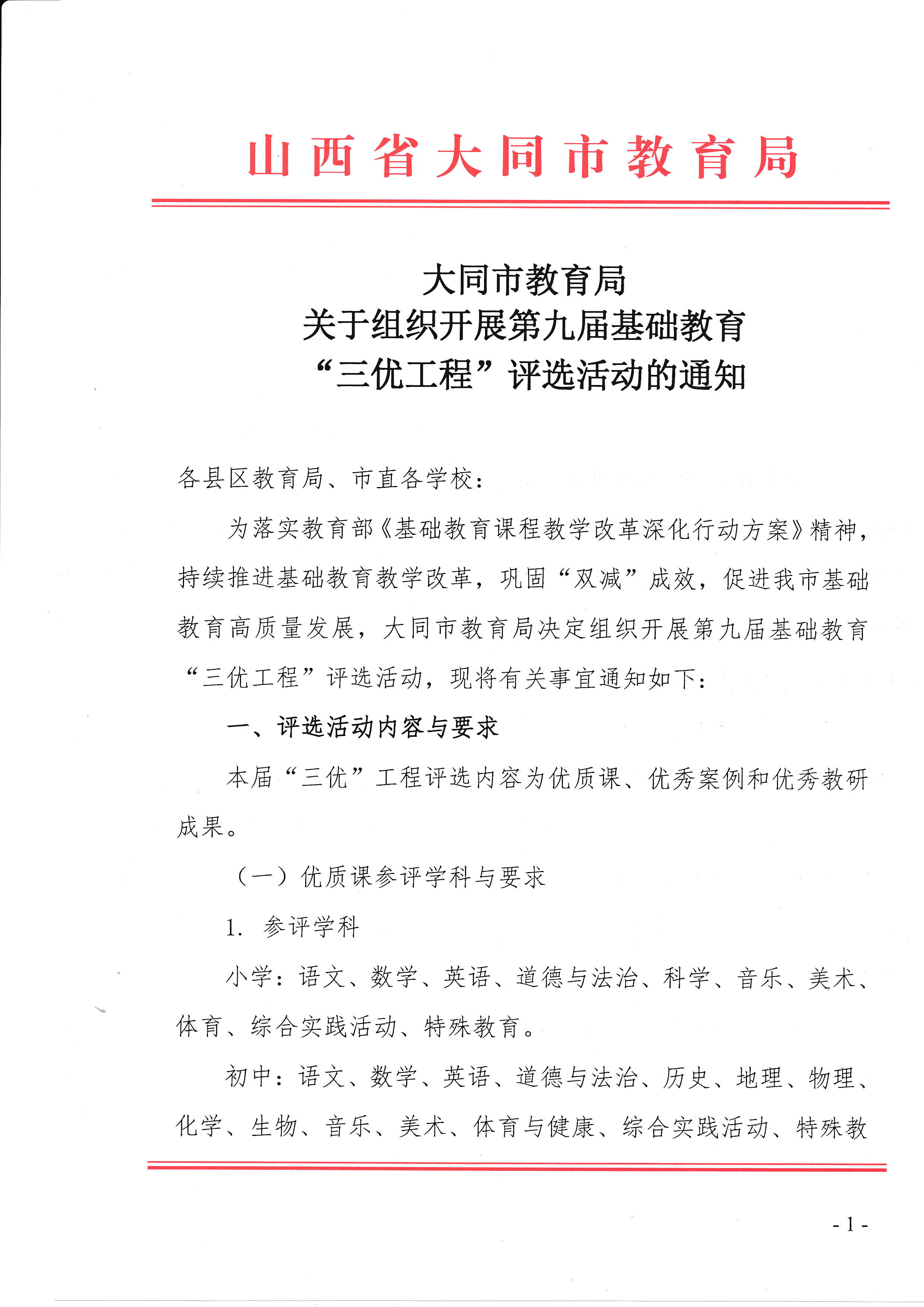 关于大同市教育局组织第九届基础教育“三优工程”评选活动的通知,主要介绍了评选活动的具体内容与要求、参评对象与条件以及评选办法及材料报送要求。以下是对这些核心内容的简要概述: