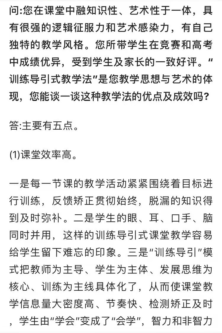 答:好的,关于训练导引式教学法,是我在1986年创建的种数学教学法,我曾进行过多年的实践,并作为一项课题进行了研究,其成果曾获内蒙古教育学会优秀教研成果一等奖,1996年我在时任鄂尔多斯市数学学会理事长李庭华老师和秘书长丰茂森老师的带领下,代表内蒙古自治区参加了华北五省区数学年会及中日数学教育交流会,在会上我进行了训练导引式教学法的专题演讲,受到与会的中日专家的一致好评。大家所知道的“题组教学法”、“问题导引教学法”、“问题导学教学法”等教学模式与“训练导引式教学法”是类似的。